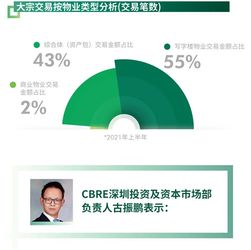 “展望未來,深圳良好的城市發展前景和利好政策的疊加,將不斷吸引外地來深的企業來此購買物業、設立公司,而供應面寫字樓物業的不斷增多亦為市場提供了更多選擇,寫字樓的大宗交易將繼續引領整個深圳商業物業投資市場。中短期內的大宗交易主要以自用型購買為主,且間斷性看到有投資公司參與其中。與此同時,工業類物業的城市更新增值也將令其受到更多投資者的關注。深圳大宗交易市場活躍度將不斷提高,交易額也將隨之增長。此外,周邊衛星城市的物流資產也越來越受投資者青睞!