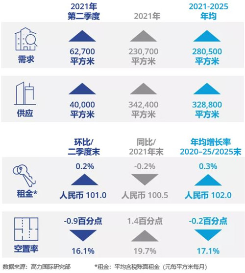 隨后的2022年,預計全年仍將有超60萬平方米的新增供應面積,此后供應回落,平均租金逐步回升。