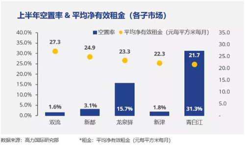 租金及空置率:受益于活躍的市場需求,雙流、新都及新津等子市場租金逐步企穩。另一方面,在高供應及高空置率的“雙高“壓力下,青白江子市場租金持續松動,第一二季度分別環比下跌1.8%、0.6%。受此影響,全市高標庫市場平均凈有效租金較2020年下半年下降1.0%至人民幣24.0元/平方米/月。全市空置率環比下降3.5個百分點至12.9%。