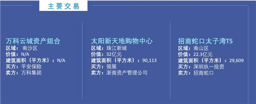 深圳方面,平安保險收購萬科云城商業組合100%股權。深圳國際集團以 15.6 億元收購23,800平方米寫字樓自用,CDL收購某商業園區55%股權,招商蛇口以22.3億元將南山太子灣近30,000平方米寫字樓出售給某國內投資者。