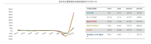 2021年一季度,武漢市經濟開局表現良好,主要經濟指標均呈現同比快速增長,其中固定資產投資,較去年同期大幅增長約343.3%,顯示出強有力的復蘇態勢。橫向對比來看,2021年一季度武漢市地區生產總值3574億元,在9個國家中心城市中排名第6位。以上海為標尺對比國家中心城市主要經濟指標值,武漢市雖然在常住人口、社零額和第三產業增加值等方面仍有較大的增長空間,但在人均GDP和城鎮人均可支配收入表現上較為亮眼。