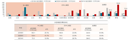 2021年上半年,整體市場量價齊升。武漢共掛牌出讓地塊91宗,其中最終成交84宗,成交宗數較去年同期增加35宗。2021年上半年武漢土地成交樓面地價6653.6元/平方米,較去年同期上漲約17.0%。遠城區成供地主力,蔡甸、黃陂和江夏等片區土地成交面積均同比大幅提升。次中心城區成交主力集中在東湖高新和沌口。中心城區土地成交面積持續下降,僅占上半年成交面積的12.0%。從分區樓面地價來看,2021年上半年次中心城區和遠城區引領武漢市整體樓面均價的上漲,其中東西湖區、江夏區、東湖高新區、新洲區、經濟開發區(沌口)、黃陂區漲幅顯著。