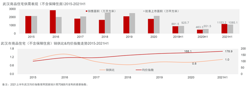 2021年上半年,武漢市商品住宅批準上市面積1085.1萬平方米,從銷供比來看,市場整體暫處供需均衡狀態:2021年上半年銷供比1.0,處于合理區間。銷售均價指數顯示,截至2021年6月武漢市商品住宅成交均價較2020年末上漲約5.6%。