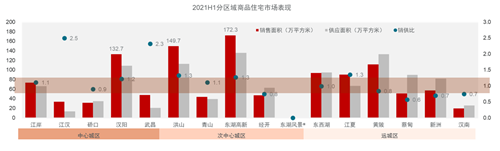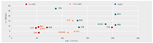 從分區商品住宅存量結合其過去6個月的去化速度來看:中心城區和次中心城區的整體出清周期要整體短于遠城區,其中東湖高新區、洪山區和漢陽區存量超100萬平方米但出清周期仍能保持在10個月以內,顯示出較高的區域市場熱度;遠城區只有江夏區目前的出清周期在10個月以內。整體來看,上半年武漢市商品住宅市場區域分化顯著,由于市場購房主力仍以剛需為主,成交主力板塊集中在次中心城區。此外,遠城區的部分區域如東西湖、黃陂和江夏熱度有上升趨勢,或將成為下一波潛力熱點板塊。