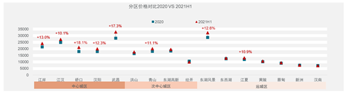 從分區銷供比來看,上半年除中心城區江漢和武昌區出現較為明顯的供不應求、遠城區的蔡甸、新洲和漢南有略微的供過于求外,武漢市大部分區域仍處于銷供比的合理區間。從分區成交價格來看,中心城區引領上半年武漢市房價上漲,較2020年末漲幅超10%的區域均大部分集中于中心城區,中心城區以外只有青山區和江夏區漲幅超10%。