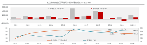 2021年上半年, 恒隆中心和泛悅中心T2的入市為武漢甲級寫字樓帶來約20.4萬平方米的優質新增供應,推動全市優質甲級寫字樓存量至245.0萬平方米。近期優質項目的陸續交付推動武漢甲級寫字樓市場吸納持續回暖,上半年核心商務區共錄得約9.0萬平方米的凈吸納量。另一方面,新項目的集中入市也推動了市場整體空置率的上升,截至二季度末武漢核心商務區甲級寫字樓整體空置率34.6%,環比一季度下降約0.2個百分點,比去年同期上升約3.8個百分點。租金方面,面對新一輪的供應井噴期,業主紛紛下調租金以加速去化。