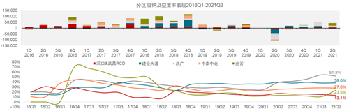 一季度恒隆中心以及二季度光谷泛悅中心T2的交付均帶動所在商務區整體吸納情況回升。從分區空置率情況來看,漢口片區由于甲級寫字樓存量較大,優質新項目的集中交付短期內增加市場去化壓力、空置率攀升,區域內的武廣商務區目前是武漢核心商務區中空置率最高的區域,截至2021年二季度末錄得空置率51.8%;其次是建設大道商務區,二季度末空置率38.0%。