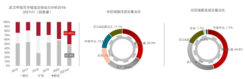 從租賃成交企業類型來看,上半年武漢甲級寫字樓租賃需求主要來自專業服務業、TMT和金融行業。從成交驅動因素來看,隨著武漢市經濟快速復蘇及招商引資政策的全面推進,甲級寫字樓市場新設企業辦公需求逐步增長,新設租賃需求約占上半年武漢甲級寫字樓市場成交量的約50.9%。分區域來看,不管是新設需求還是搬遷需求均集中在存量較大且近期新交付樓宇較多的漢口片區。此外值得注意的是光谷商務區上半年成交需求主要表現為搬遷,由于光谷片區甲級寫字樓市場整體一直處于供不應求的狀態,泛悅中心T2的交付帶來了搬遷需求的釋放空間。下半年,武漢核心商務區甲級寫字樓市場預計還將迎來包括武漢天地A1、首地王家墩、中海中心等在內的約29.9萬平方米的優質辦公空間集中交付。