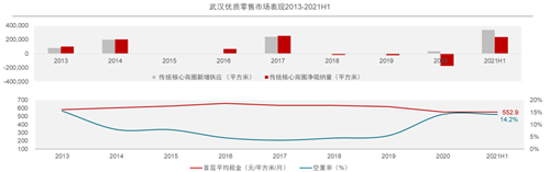 2021年上半年恒隆廣場、K11藝術購物中心Ⅰ館、江宸天街的開業為武漢核心商圈優質零售市場帶來約33.8萬平方米的優質新增供應,推升四大核心商圈優質零售項目總存量至263.4萬平方米。上半年優質項目的陸續開業帶動市場整體吸納回升,租金穩中略降,截至2021年二季度末武漢四大核心商圈首層平均租金錄得552.9元每平方米每月,同比下降約4.4%。