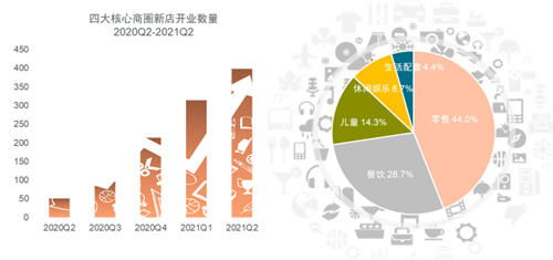 從核心商圈新店開業情況來看,上半年伴隨優質新項目的陸續開業,武漢市核心商圈新店開業數量持續攀升,零售、餐飲和兒童類業態是市場主要擴張業態。此外值得注意的是生活配套類業態中近期新能源汽車展廳紛紛開始入駐購物中心,上半年包括比亞迪、東風嵐圖、哪吒汽車、高合汽車等在內的多個新能源汽車品牌展現出較為明顯的擴張態勢。
