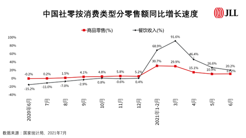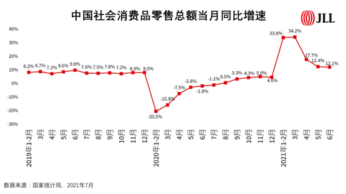 2021年上半年,中國社會消費品零售總額(社零總額)211,904億元,同比增長23.0%。4-6月,社零總額按月持續回升。五一長假、端午小長假、“618”網購狂歡節成為二季度拉動中國消費的關鍵觸點。消費加速回升,市場對消費端后市看漲的預期繼續增強。
