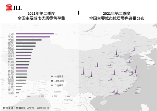 零售物業開發回歸一線與1.5線城市,長江經濟帶頭部城市成為近期市場熱點。截至2021年第二季度,上海、北京、成都、重慶、武漢五城的優質零售物業存量均超過750萬平方米,規模位居全國前五,其中京滬兩大一線城市的存量分別已接近1,400萬和1,500萬平方米,遙遙領先。北方地區的增量供應主要集中在北京和西安兩市。相較而言,長三角與長江經濟帶的主要城市則成為當前與未來兩年優質零售商業新增項目的重點區域。