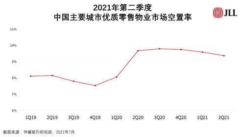零售物業市場逐步走出疫情陰霾,全國優質零售物業空置率連續三個季度回落。伴隨中國疫苗接種率上升及疫情防控進入常態化,零售消費逐步恢復常態,零售物業市場亦隨之迎來需求回暖。強線下渠道屬性的業態,如餐飲業態恢復市場活力,餐廳客流出現明顯回升,新增需求逐步活躍。咖啡茶飲在新一輪的資本加持下,加速擴張,品牌之間的競爭加劇、客單價差距拉大,客群分層加速顯現。此外,新能源汽車、娛樂潮玩、健康生活類新興業態和品牌也展現出較強的承租能力。仲量聯行數據顯示,截至二季度末中國20個主要城市優質零售物業市場平均空置率錄得9.4%,按同口徑算環比下跌0.2個百分點。盡管新增供應保持高位,但空置率環比已連續三個季度實現回落,顯示出市場回暖的良好跡象。然而,整體空置率仍高于疫情前水平。