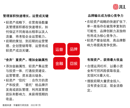 輕資產戰略下,運營商的在營商場數量及管理面積快速增長。從前策到后期運營管理、企劃營銷等環節,都是輕資產模式成功的關鍵。由于商業體或商業模式容易被簡單復制,品牌創新力及獨特性將成為核心競爭力之一。通過添加“金融屬性”,輕資產可以通過合理運用杠桿,以最小的資金和可控的風險來實現最大化利益。