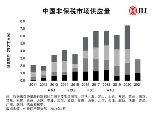2021年第二季度,仲量聯(lián)行追蹤的全國主要物流市場的新增供應(yīng)大幅增長至200萬平方米,遠高于一季度的80萬平方米。從主要城市群來看,本季度長三角和成渝地區(qū)提供了超過65%的新增供應(yīng),上海、武漢、成都、重慶幾個大型項目的完工為這些城市各貢獻了超過20萬平方米的新增供應(yīng);京津冀與大灣區(qū)的新竣工項目相對較少。