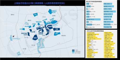 2021年第二季度,上海市寫字樓租賃市場成交活躍,凈吸納量為19.6萬平方米。因此,上海寫字樓市場在2021年上半年的凈吸納量達到40萬平方米,超越了2019年全年和2020年全年的凈吸納量。核心區在本季度的表現搶眼,凈吸納量環比翻倍,租金亦環比上漲0.7%至271.87元每月每平米。次中心區的租金環比持平,整體市場的平均租金環比微漲0.4%。