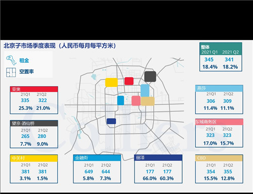 在今年二季度,北京甲級寫字樓市場延續了一季度的強勢行情,企業新租擴租意愿強烈,租賃市場持續放量。截止到2021年Q2,全市場凈吸納量近37萬平方米,扣除自用和預租面積后,市場去化量近25萬平方米,基本和一季度持平。相較歷史平均數據而言,北京甲級寫字樓市場上半年累計超過50萬平方米的去化量已經達到歷史全年平均凈吸納量的水平,同時這也是近十年來首次連續兩個季度出現超過20萬平方米的市場去化。雖然本季度新入市項目增加到31萬平方米,但強勁的需求導致空置率進一步降低到18.2%。本季度市場平均租金約為341元每月每平米,環比降幅持續收窄。在子市場方面,大部分市場均釋放出積極的去化信號,其中CBD、麗澤和東城商務區去化表現亮眼。中關村市場已經成為目前北京空置率最低的子市場,僅有1.5%。