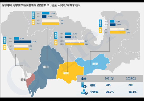 高力國際中國區辦公樓服務部董事總經理嚴區海表示,雖然今年上半年市場表現優異,但依然不能忽視深圳市場將從今年下半年開啟一輪供應高峰的事實,僅2021年下半年預計就將有超百萬的新項目入市。屆時短期內供過于求的問題將更加突出,市場空置率將重拾上升趨勢,市場競爭加劇將不可避免,相信市場將出現更有競爭力的租金水平和租賃條件。然而,在這樣的大環境下,市場分化將不可避免,樓宇間的分化也會進一步加大。十四五期間,短期大規模集中入市的新項目將拖累市場租金持續走低。相較于更加明確的供給壓力,產業發展的強勁程度和擴張速度將在很大程度上決定本輪市場調整的深度和時間長度。深圳市委在二季度發布了《深圳市國民經濟和社會發展第十四個五年規劃和二〇三五年遠景目標綱要》,強調了創新驅動發展的戰略,強調了培育新動能、新勢能的重要性,提出了建設具有全球影響力的科技和產業創新高地的目標。因此,我們有理由相信深圳在十四五期間將逐步形成服務于高端高質高新現代化產業體系的寫字樓市場格局。