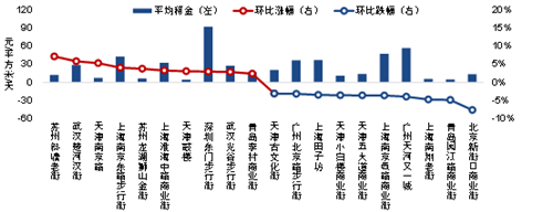 與此同時,50.0%的商圈寫字樓租金仍處于下跌階段,一方面由于部分二線城市高端租賃需求依舊恢復較慢,租金上漲動力不足;另一方面,部分新增供應(yīng)較多的商圈依舊面臨空置壓力,租金仍處下行通道。具體來看,在寫字樓租金環(huán)比下跌的商圈中,青島五四廣場商圈跌幅最大,為1.98%;廣州體育中心、廣州北京路等7個商圈跌幅亦在1%以上,青島中央商務(wù)區(qū)、上海徐家匯等12個商圈跌幅在0.5%-1.0%之間,重慶觀音橋、成都大源、南京珠江路等20個商圈跌幅在0.5%以內(nèi)。
