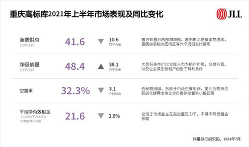 自2020年起,重慶進入高標庫集中供應期,大面積高性價比倉庫入市為租戶擴租、倉儲升級,以及業主吸引新租戶創造了有利條件。2021年上半年,重慶高標庫市場需求延續2020年第四季度活躍態勢。快遞快運、社區團購企業持續錄得擴租;同時部分非高標庫租戶(如大宗商品交易市場商戶)在高標庫業主以價換量的租賃策略影響下,倉儲設施升級需求得以釋放。此外,重慶市場較低的租金水平帶動高標庫租戶下沉,租戶行業更趨多元。期內,更多制造業企業利用市場化高標庫項目拓展存儲空間,彈性應對銷售淡旺季。例如在銷售旺季將貨品從廠區轉移至外部倉庫,以提升整體貨品周轉規模。活躍的市場需求帶動全市整體空置率從2020年第三季度41.4%的高位快速回落9.1個百分點至32.3%。