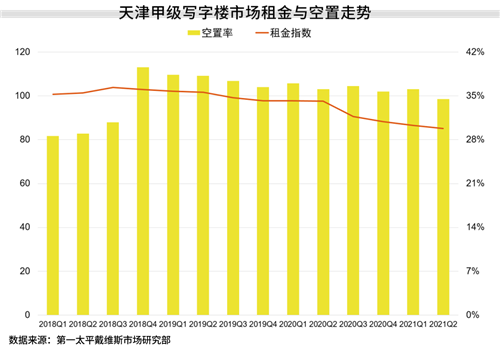 上半年,天津甲級寫字樓市場新增供應入市趨緩,市場以消化現有空置面積為主,租賃市場整體去化較好,空置率同比下降1.6個百分點至34.5%,為近幾年的最低點。