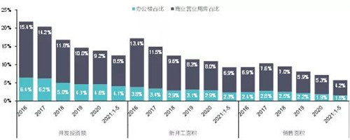 圖:2016-2021年前5個月全國商業(yè)營業(yè)用房及辦公樓投資、新開工面積、銷售面積占比