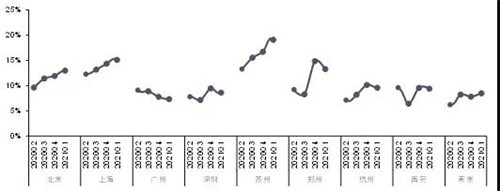 圖:2020年二季度-2021年一季度代表城市寫字樓空置率
