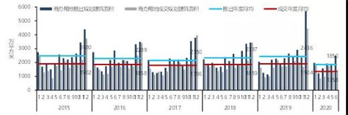圖:2016年-2021年6月全國300城商辦用地推出及成交面積