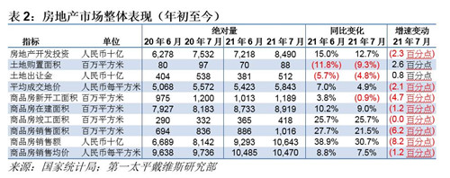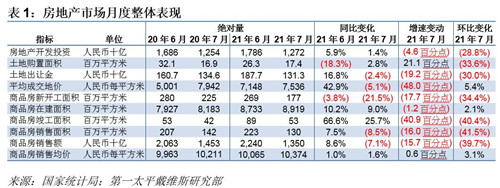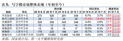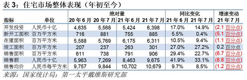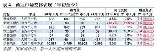 更值得關注的是,7月商品房銷售面積與銷售額同比增速放緩。月度表現與2019年同期相當,但不及去年同期水平。融資收緊、政策趨嚴而市場情緒降溫,共同影響銷售去化節奏。
