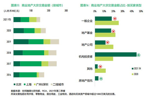 一線城市在2021年上半年的投資總額中占比為60%,其中上海的交易額突破300億元,重回城市榜單首位。在多個大型資產包交易的帶動下,二線城市交易額占比升至39%,投資者對于核心二線城市中消費升級驅動的零售和倉儲物流投資抱持積極態度。