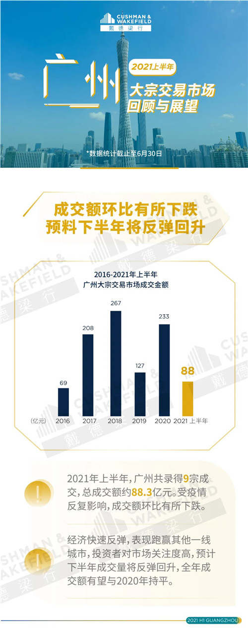 [提要]上半年廣州共錄得9總大宗交易成交,總成交額88.3億元,受疫情反復影響,成交額環比有所下跌。預計下半年成交量將反彈回升,全市成交額有望與2020年持平。