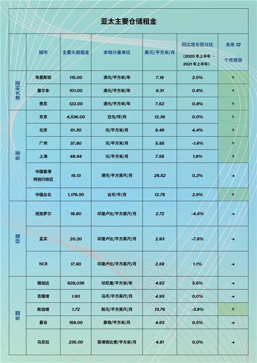 根據英國運輸情報顧問公司(Transport Intelligence)公布的數據顯示,受新冠疫情的正面影響,亞太地區的電子商務物流市場于去年增長22%左右,達到約1,530億歐元(1,820 億美元)。盡管區域內有疫情反復的現象,但亞太地區的主要倉儲租金基本保持不變,同比小幅下降 0.1%。在堅韌的基本面支撐下,預計亞太地區倉儲市場將保持積極態勢,并穩定下半年的租金情況。