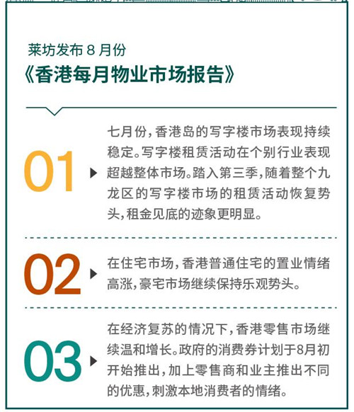 在疫情穩定、經濟逐步好轉的情況下,7月份住宅市場表現穩定。當月一手住宅市場置業氣氛強勁,按月上升5%,達至2,052宗交易。豪宅市場持續向好,錄得多宗超過2億港元的大額成交。