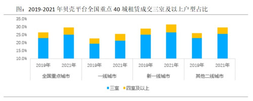 根據貝殼研究院數據,2021年全國重點40城租賃成交房源中,三室及以上的成交占比達到29.6%,相比于2019年增加了5.8個百分點,其中三室占比增加了4.5個百分點。