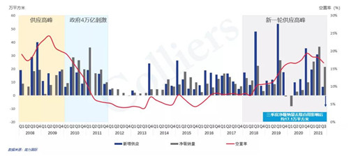 北京甲級寫字樓新增供應,凈吸納量和空置率(2008-2021)