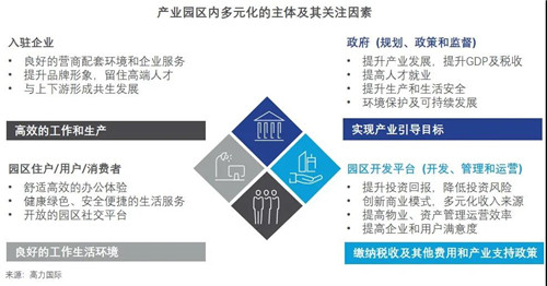 不同于寫字樓等由市場化主體開發運營的物業,產業園區主要由政府主導規劃和監管、園區開發平臺開發和運營管理,形成多方關聯、交錯的業務生態環境。各方在智慧園區建設中所承擔的角色、參與的動機及訴求各不相同。
