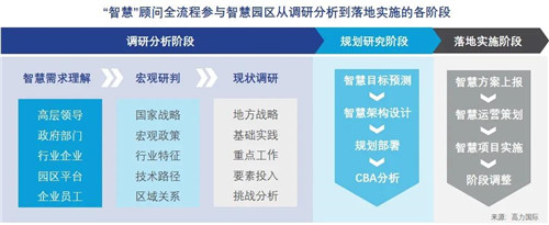 高力國際研究發現,缺乏頂層設計是造成智慧園區一系列共性痛點的根本原因。因此,應用“智慧顧問”這一角色,作為園區開發平臺在智慧園區項目中的智囊,深入智慧園區從調研分析到落地實施的各階段。不僅為園區開發平臺提供智慧需求分析、智慧目標確定、智慧方案選取等一系列核心工作,而且與設計單位、施工單位和智慧系統供應商緊密合作,確保智慧方案的順利落地。