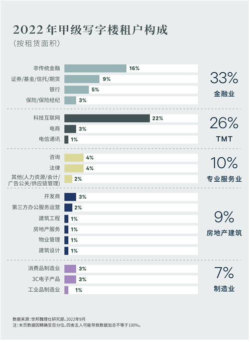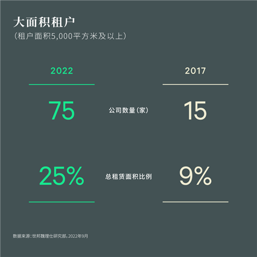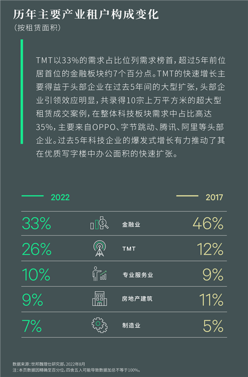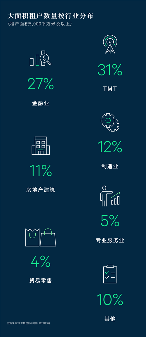 聚焦5,000平方米以上的特大型租戶,對(duì)比2017年以銀行、保險(xiǎn)和證券為主的金融板塊為主的需求結(jié)構(gòu),受近年來頭部科技企業(yè)的快速擴(kuò)張帶動(dòng),2022年科技板塊需求位列榜首,占比為31%,高于金融板塊4個(gè)百分點(diǎn)。