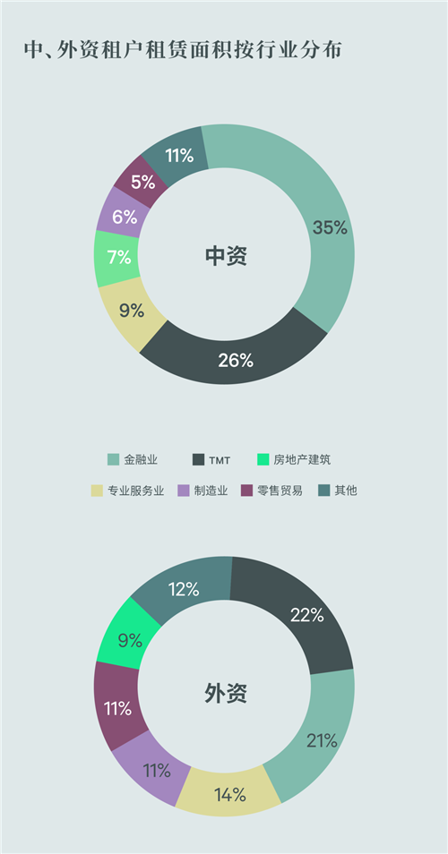 金融和科技板塊需求共同增長推動(dòng)內(nèi)資企業(yè)需求占比相對(duì)2017年提升7個(gè)百分點(diǎn),二者占比約6成左右。科技行業(yè)對(duì)內(nèi)資企業(yè)需求貢獻(xiàn)比例增長較為明顯,較2017年增長約15個(gè)百分點(diǎn),包括大面積需求的頭部企業(yè),以及圍繞頭部企業(yè)搭建的科技生態(tài)鏈所吸引的上下游中小型科技企業(yè)也在積極擴(kuò)張。與此同時(shí),外資企業(yè)的擴(kuò)張也主要來自于科技行業(yè)的貢獻(xiàn),從外資企業(yè)需求細(xì)分來看,TMT板塊以22%的需求占比位居首位,科技互聯(lián)網(wǎng)子版塊需求占主導(dǎo)地位,吸引了包括三星、IBM和高通等在內(nèi)的知名企業(yè)的進(jìn)駐。以科技企業(yè)擴(kuò)張為主的外資企業(yè)需求為主帶動(dòng)科技屬性最強(qiáng)的高新園片區(qū)的外資企業(yè)需求占比對(duì)比5年前提升3個(gè)百分點(diǎn)。
