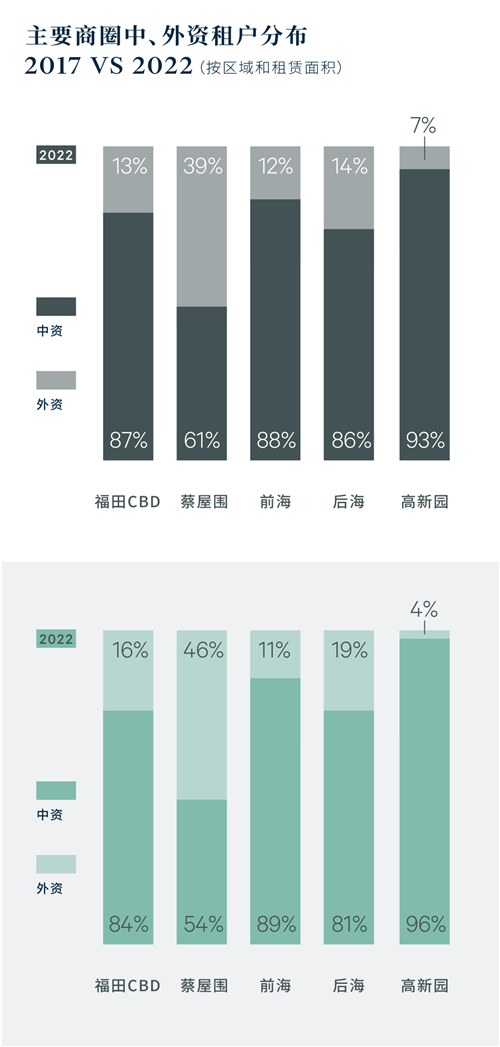 對(duì)比2022年與2017年的租戶普查結(jié)果,深圳甲級(jí)寫字樓市場(chǎng)前兩大需求行業(yè)來源保持不變 ,其中TMT需求在過去五年擴(kuò)張最為明顯,同比上升超14個(gè)百分點(diǎn),呈翻倍增長。排名前五的行業(yè)面積占比提升2個(gè)百分點(diǎn),除科技和金融以外,制造業(yè)提升2個(gè)百分點(diǎn),房地產(chǎn)減少2個(gè)百分點(diǎn)。
