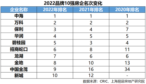 ??根據(jù)測評報告,榜單前三由中海、萬科和保利占據(jù)。中海繼續(xù)位列榜首,品牌價值為807億元,萬科、保利分別以758億元和546億元位列第二位和第三位。華潤置地、碧桂園、招商蛇口、龍湖、金地、中國金茂和新城分列四到十位。報告顯示,2022年50強品牌房企位次變動較大。其中,50強榜單變動率為50%,較上年大幅上升36個百分點;20強榜單變動率為40%,較上年上升30個百分點;10強榜單變動率為20%,與上年持平。