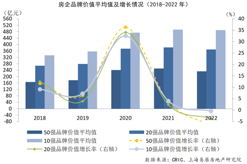 從2018-2022年房地產(chǎn)企業(yè)品牌價值測評結(jié)果看,企業(yè)品牌價值總體稍有回落。數(shù)據(jù)顯示,2022年,10強、20強和50強的品牌價值均稍有回落,增長率近五年來首次為負。其中,50強的品牌價值均值由上年的251億元回落至234億元,同比下降6.77%,2018至2022年的年均復合增長率約為7.03%;20強的品牌價值均值由上年的383億元回落至369億元,同比下降3.66%,2018至2022年的年均復合增長率約為6.59%;10強的品牌價值均值由上年的493億元回落至490億元,同比下降0.45%,2018至2022年的年均復合增長率約為8.05%。