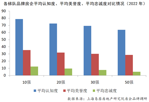 通過連續(xù)三年消費者調(diào)研,從認知度、美譽度和忠誠度三個維度分析房企的品牌特征。總體來看,2022年,50強品牌房企的認知度有所提升,美譽度和忠誠度則出現(xiàn)不同程度的下降。其中,平均認知度為45.26%,較上年上升1.77個百分點,各梯隊認知度均較上年有所提升;平均美譽度為29.43%,較上年下降5.07個百分點;平均忠誠度為5.07%,較上年下降2.86個百分點。從分化程度看,各梯隊品牌房企認知度分化程度較小,方差較上年有所縮小,為1.01%;美譽度和忠誠度方面分化加大,方差分別為4.83%、0.45%。尤其是10強和50強之間在美譽度和忠誠度方面差距繼續(xù)擴大,其中美譽度均值相差3.43個百分點,忠誠度均值相差7.28個百分點。