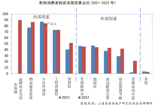 房企品牌調(diào)研結(jié)果顯示,2022年,影響消費者購房決策因素中,最重要的因素是交房保障,其次是物業(yè)服務、小區(qū)環(huán)境和工程質(zhì)量,占比分別為89.59%、84.37%、73.54%、51.23%。與2021年調(diào)研數(shù)據(jù)相比,受到部分房企項目交付困難的影響,交付是否有保障受到消費者最多關(guān)注。物業(yè)服務、小區(qū)環(huán)境同樣是消費者重要考慮因素,說明除了產(chǎn)品屬性外,房地產(chǎn)的服務屬性越來越與消費者的居住體驗相關(guān)。
