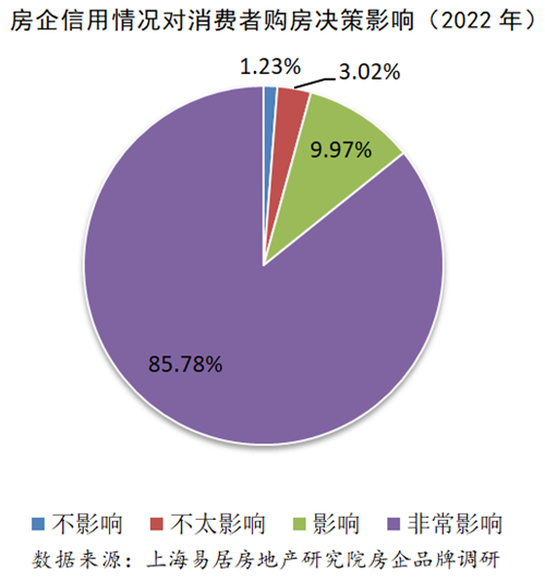 從2022年的消費者調(diào)研來看,由于部分房企出現(xiàn)交付困難等負面信息,房企的信用情況受到消費者越來越多的關(guān)注。在被問及如果開發(fā)商有債務違約等信用及財務風險情況,是否會影響購房決策時,85.78%的消費者認為非常影響,不影響和不太影響的占比僅為1.23%和3.02%。