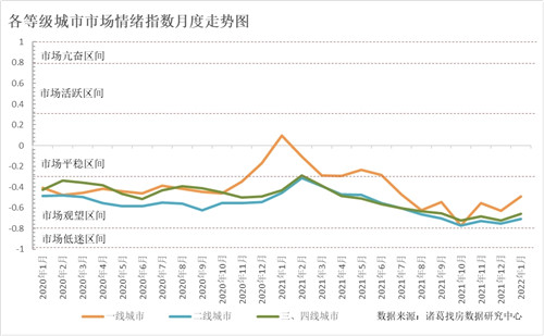 《報告》顯示,自2018年下半年起,隨著政策的收緊,全國市場情緒指數進入從平穩區間進入觀望區間,隨后全國情緒指數一直處于觀望區間,至2021年10月觸底。10月起,中央頻頻釋放政策暖風,市場觀望情緒有所好轉,2022年1月市場情緒指數較12月再次回升,為-0.68,接近于市場情緒指數的觀望區間的高位。