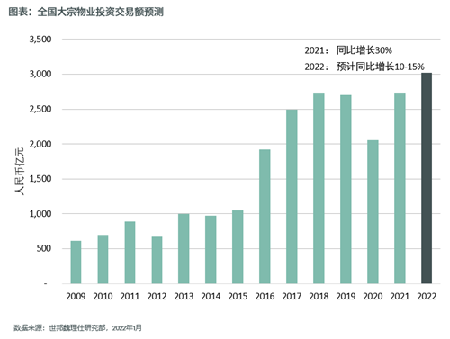 數據顯示2021年中國大宗物業投資市場迎來快速復蘇,總成交額達到2730億元,同比上漲33%。在投資和出售意愿均有所提升的環境下,預計2022年中國內地商業地產大宗交易額將同比增長10%-15%,有望首次突破3000億元。