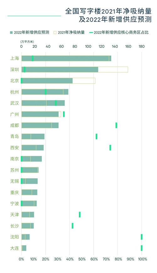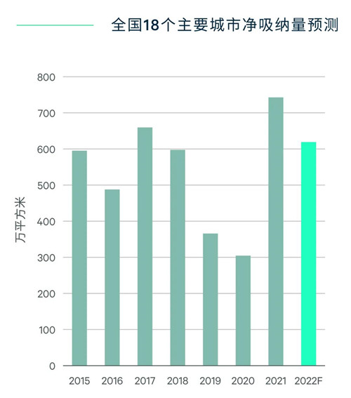 綜合以上因素,CBRE預(yù)計(jì)2022年全國(guó)寫(xiě)字樓凈吸納量將達(dá)到620萬(wàn)平方米,雖較2021年的峰值回落17%,但顯著高于過(guò)去五年530萬(wàn)平方米的平均水平。