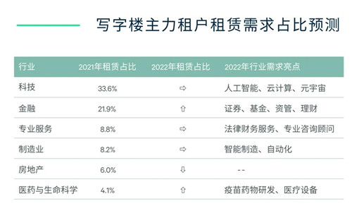 科技和金融仍將是2022年寫(xiě)字樓的主力需求引擎,我們預(yù)計(jì),兩大行業(yè)在寫(xiě)字樓租賃成交的貢獻(xiàn)占比將基本保持在2021年的水平。但助推需求的子行業(yè)將有新的亮點(diǎn)出現(xiàn)。