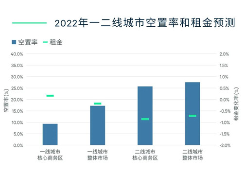 2022年,受新增供應(yīng)爆發(fā)影響,全國(guó)18個(gè)主要城市寫(xiě)字樓租金平均指數(shù)預(yù)計(jì)小幅下降0.4%?傮w需求偏弱的華北二線城市,以及空置率高企的中西部二線城市將面臨更大的租金下行壓力。